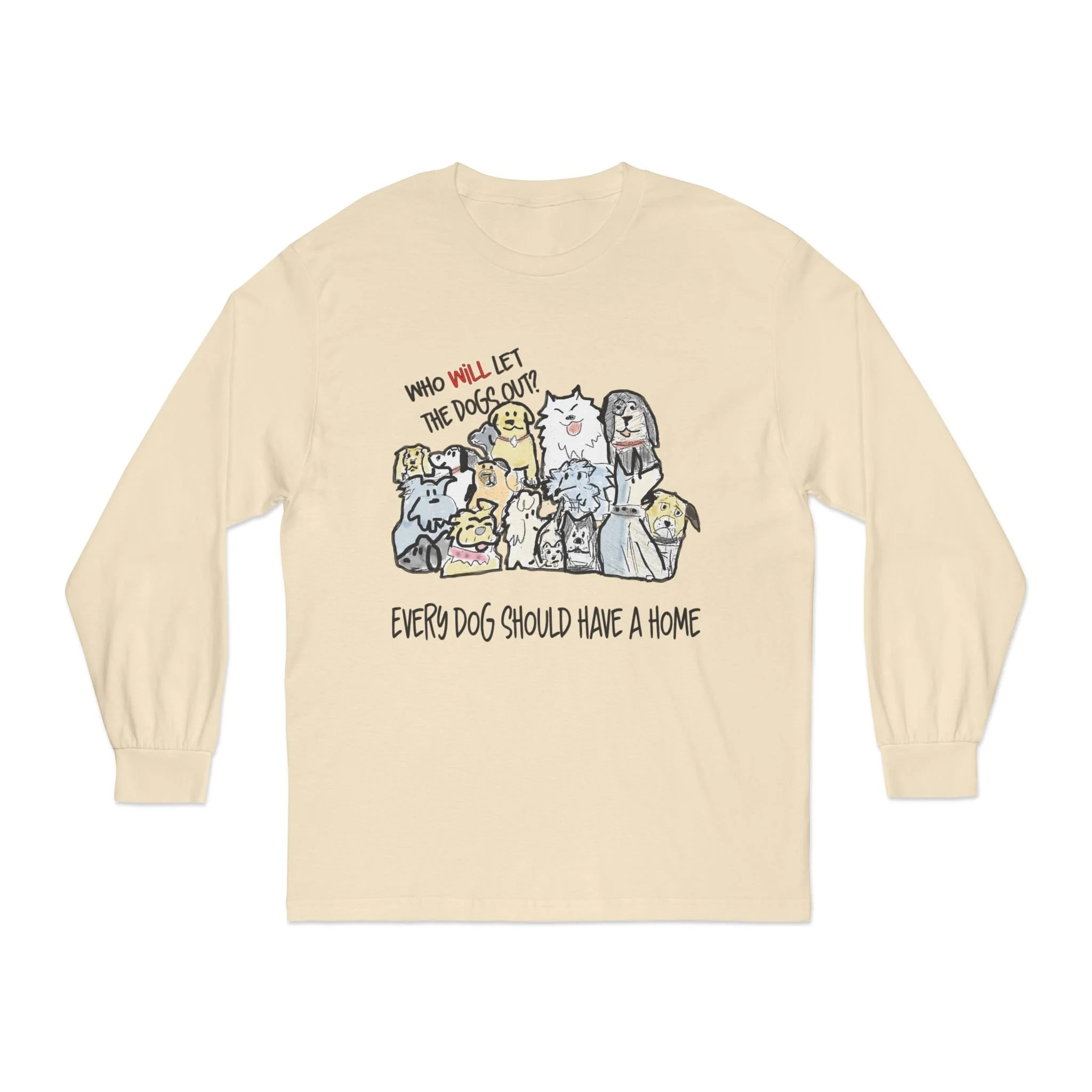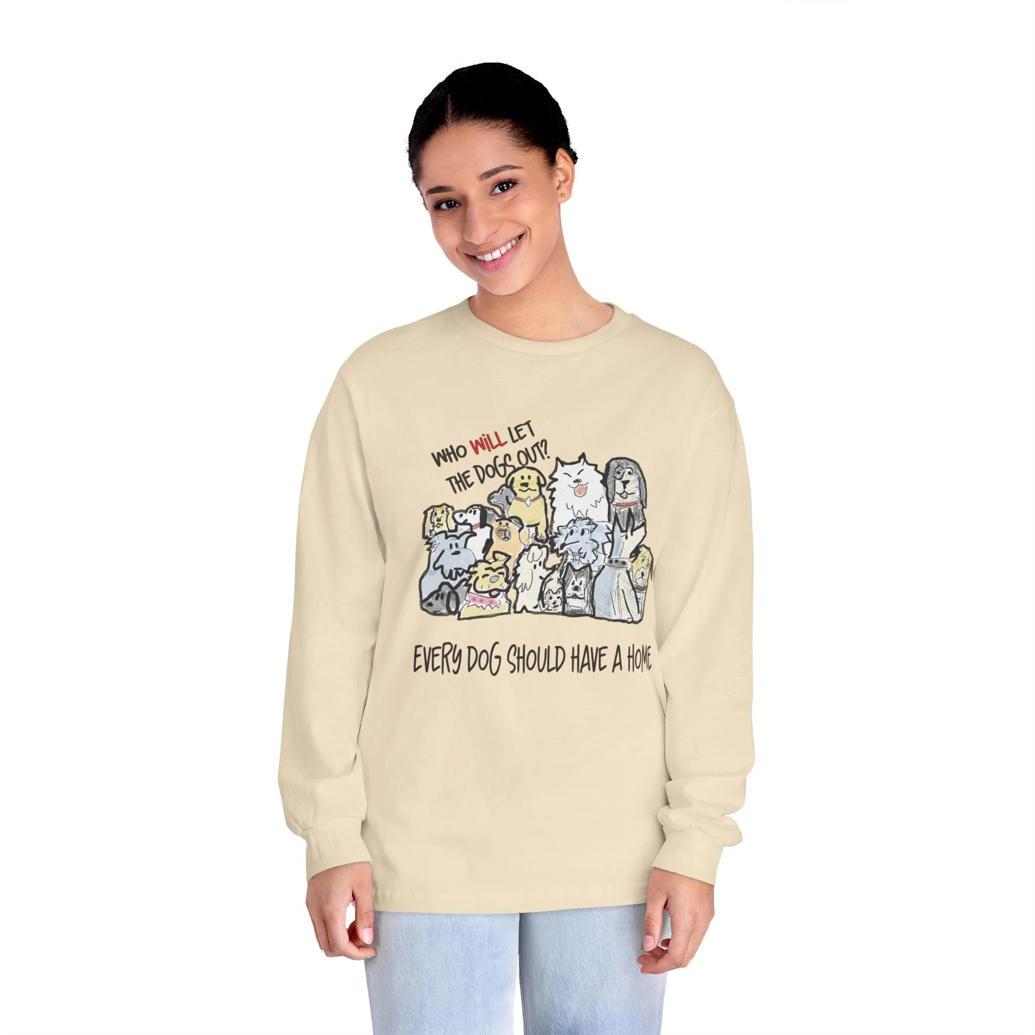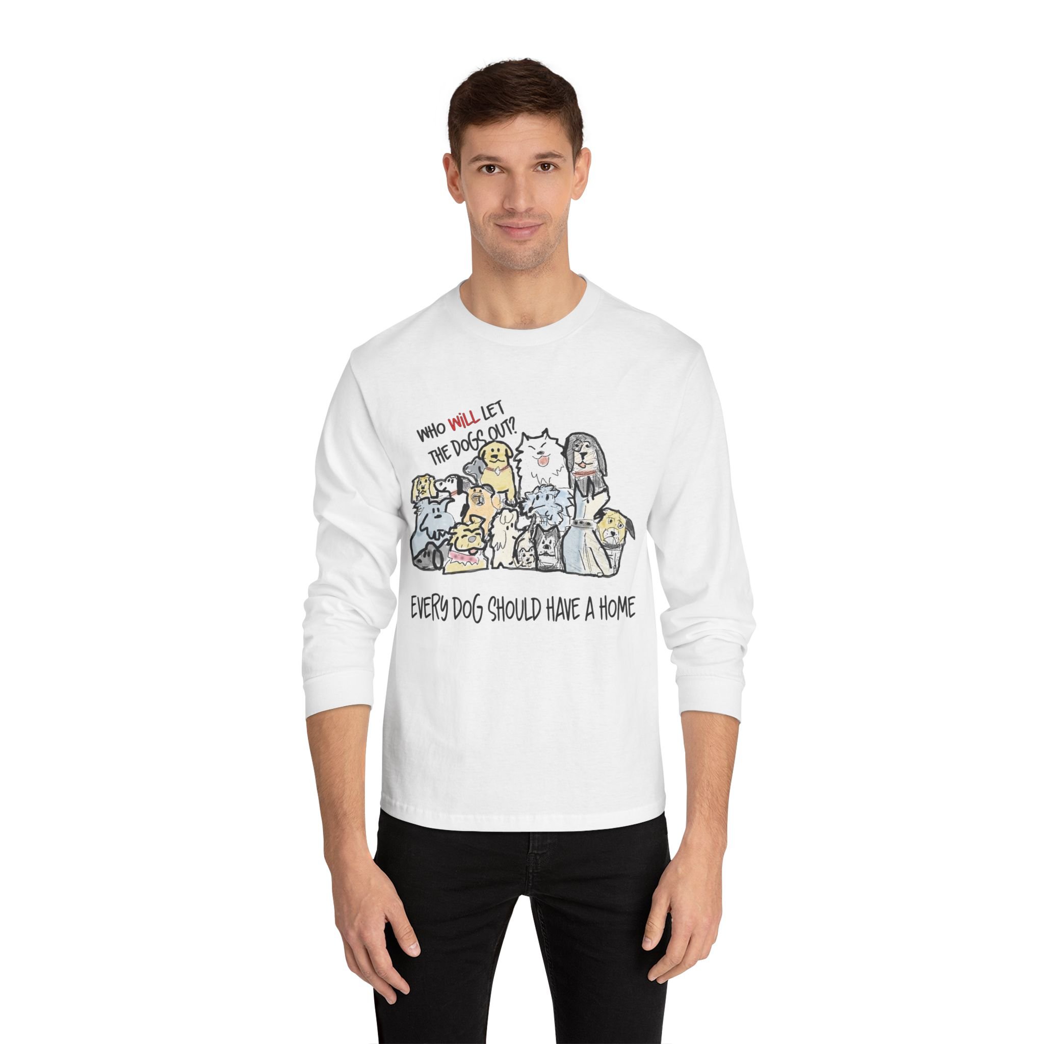 Embrace your love for dogs with this cozy Unisex Classic Long Sleeve T-Shirt. Designed for those who care deeply about animal welfare, this t-shirt features a playful design that showcases your passion for pets. Its comfortable fit and soft, breathable fabric make it perfect for everyday wear, whether you're lounging at home, heading to a casual outing, or volunteering at an animal shelter. Ideal for dog lovers, this shirt is a fantastic gift for friends or family members who advocate for rescue dogs. Celebrate special occasions like National Dog Day, birthdays, or simply everyday moments that call for expressing love towards man's best friend with this heartwarming t-shirt.