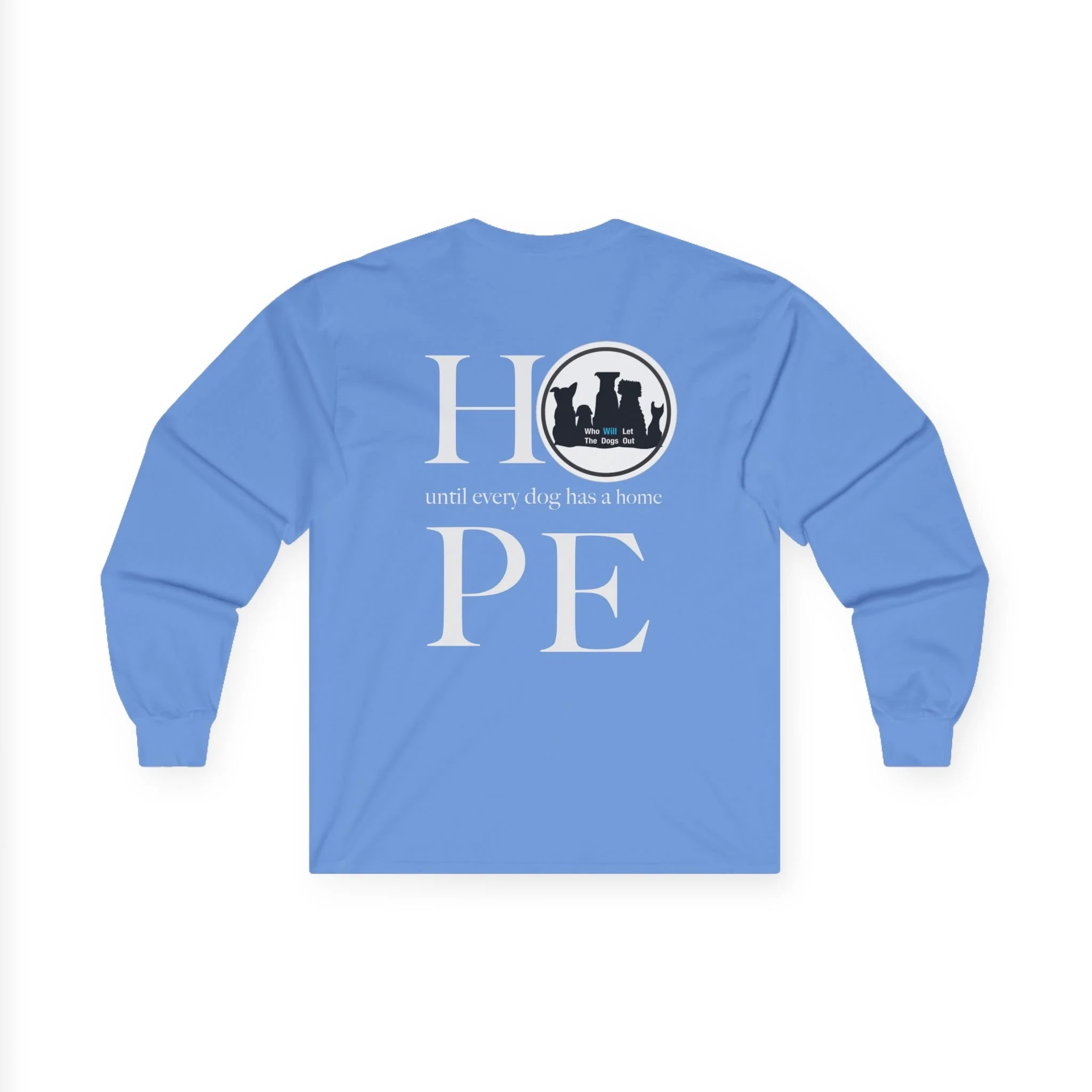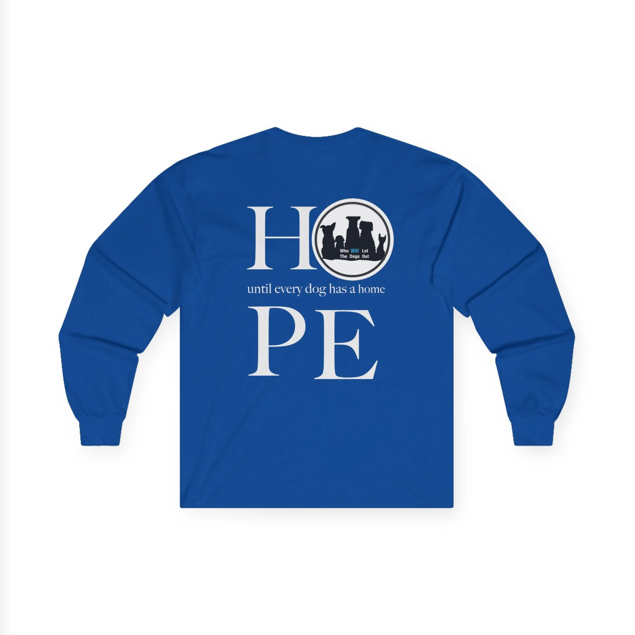 A soft, midweight long-sleeve tee made to carry a small but powerful message: every dog deserves a home. The front shows a row of playful dog silhouettes and the bold line “Who WILL Let The Dogs Out,” while the back arranges canine shapes inside a hopeful HOPE graphic. Wear this on shelter shifts, adoption events, or slow weekend walks to start conversations and show quiet solidarity with rescue work. The thicker, vintage-feel cotton and classic fit give it a lived-in comfort that layers well under a jacket or stands alone on crisp mornings. It runs slightly smaller than usual — choose one size up if you prefer a relaxed fit.
